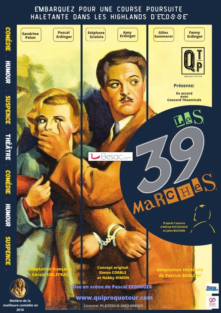 5 comédiens interprètent de multiples personnages et restituent avec loufoquerie l'univers d'Alfred Hitchcock : Londres, Les Landes écossaises, des poursuites de voiture, une histoire d'amour, d'espionnage et de suspense, tous les moments forts du film.